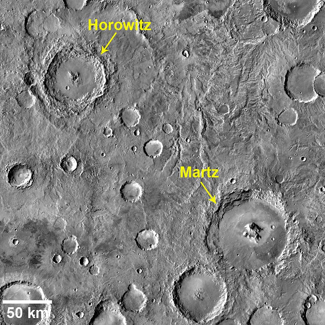 Daytime infrared view of Horowitz and Martz, two complex impact craters