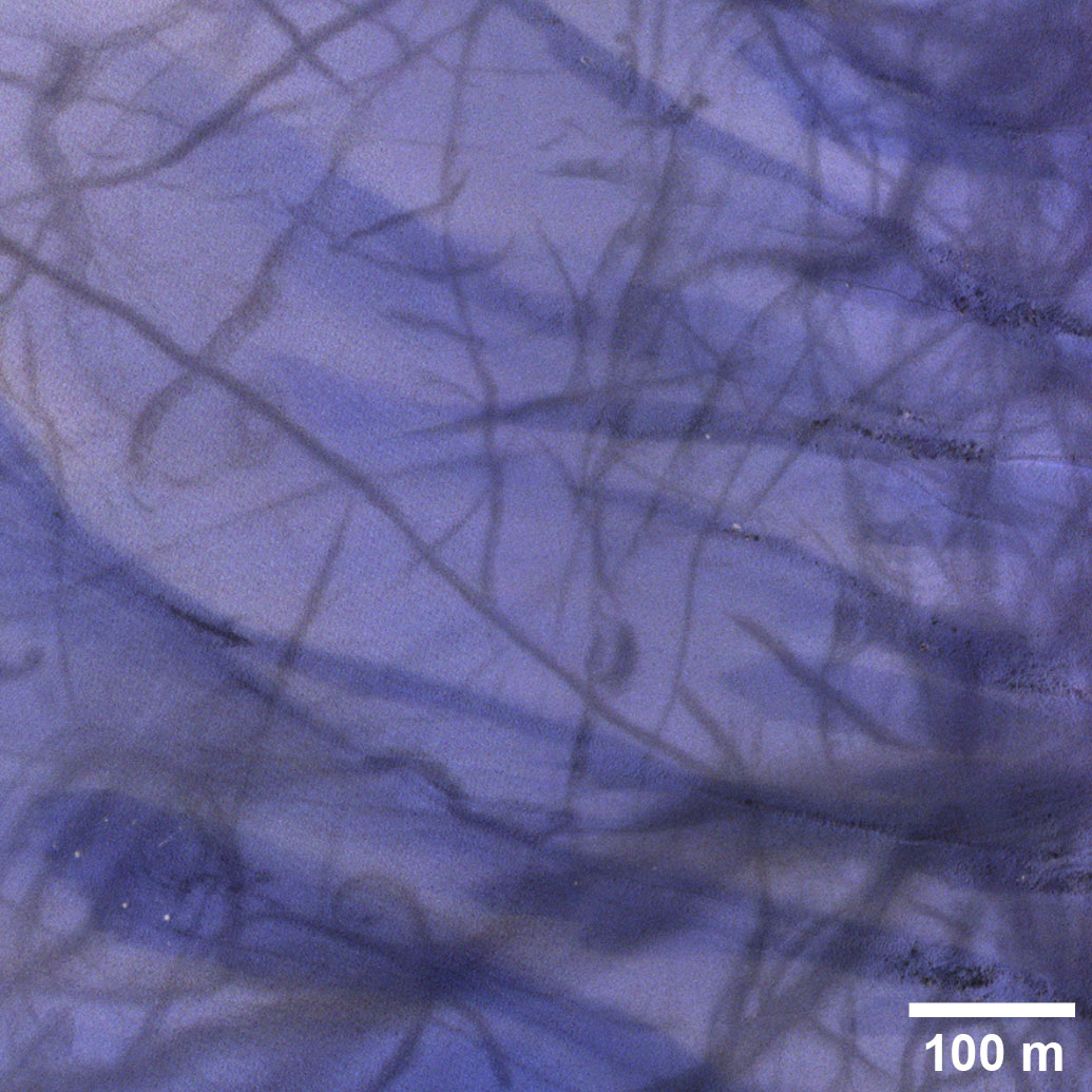 Dark dust devil tracks, with one leading to a dust devil near the centre of the image