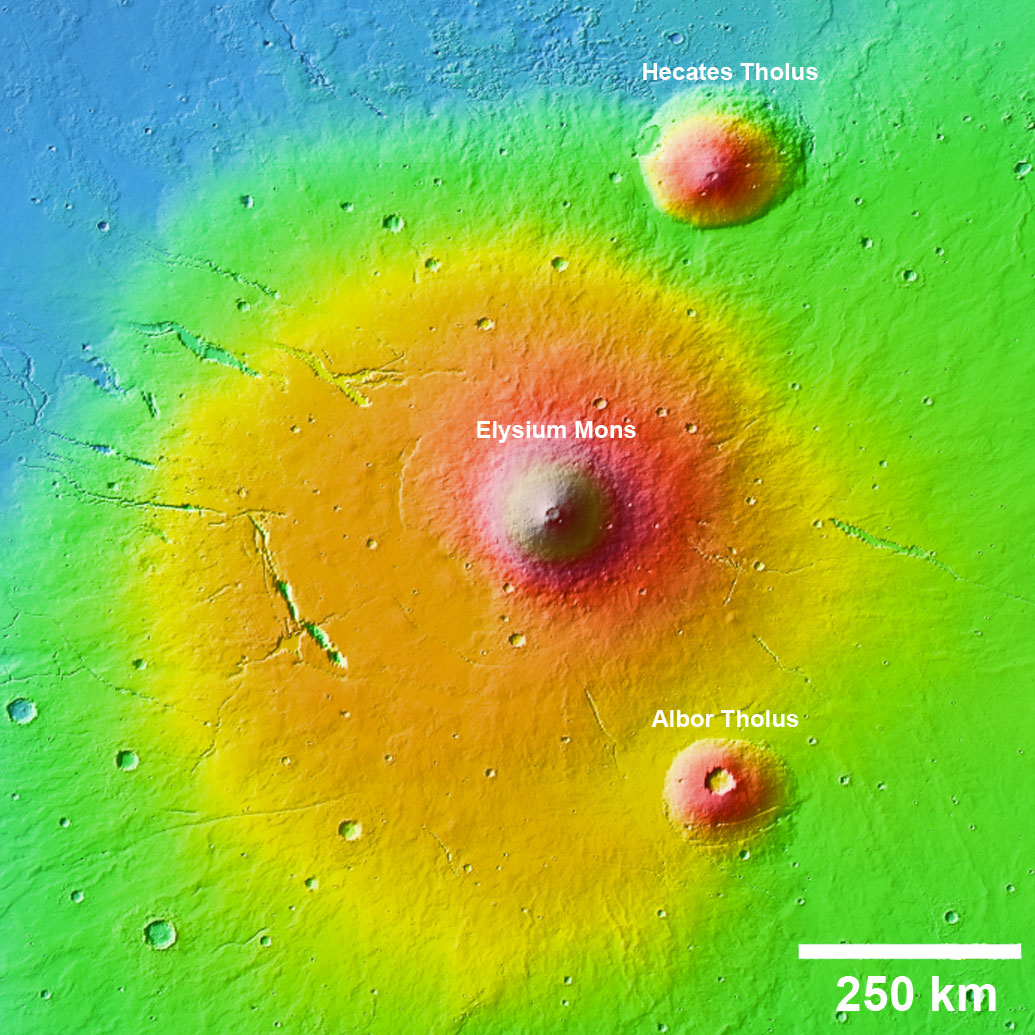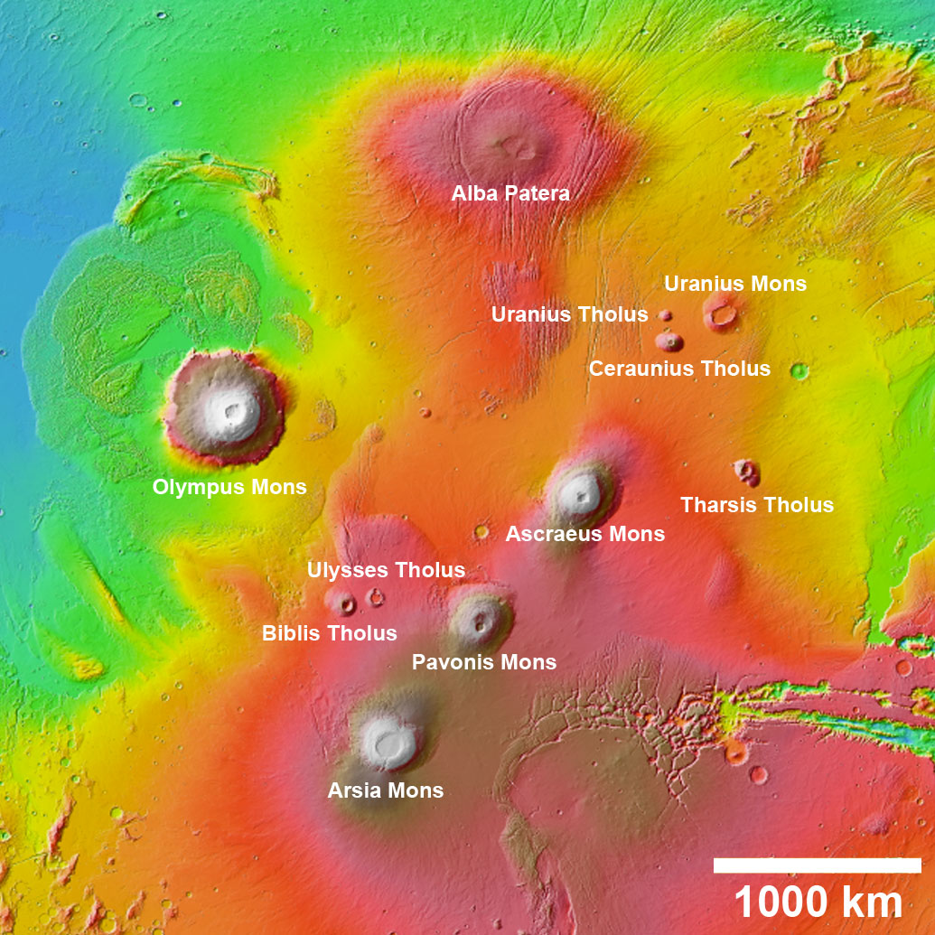 Uranius Tholus and Cernauius Tholus shield volcanoes, viewed in daytime IR