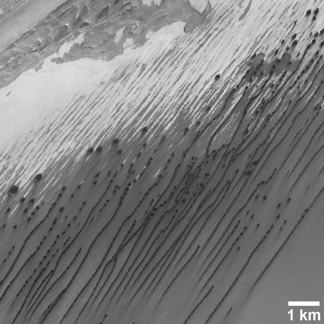 Now this one is a bit of trick question—you might be thinking, "Wait, aren’t these sand dunes?" Yes, they are, but do you see the thin dark lines scribbled all over the top of the dunes? Those are the dust devil tracks! Many dust devils have moved across these dunes, blowing away fine-grained dust on the surface to reveal the darker dune material underneath.