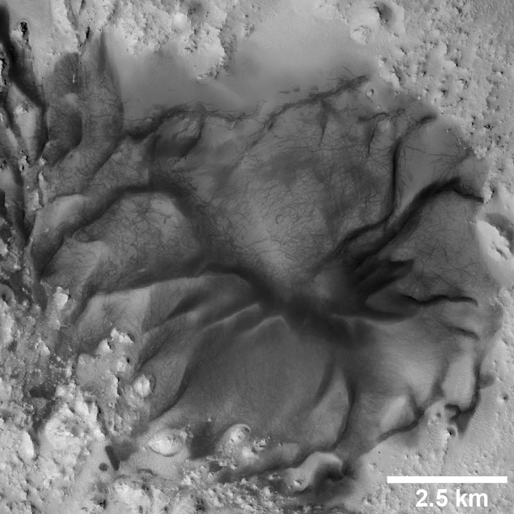 The dark features in this image are a type of sand dune called “barchan dunes.” These crescent-shaped dunes are very common on Earth and form in areas with one main wind direction. On Mars, these dunes are often found inside depressions such as craters or volcanic calderas. The dunes in this image are inside of Nili Patera, a large Martian volcano. The shape of the dunes shows that the wind here blows from northeast to southwest (upper right to lower left of the image).
