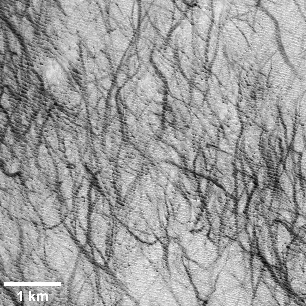 While they might look somewhat like the squiggly paths of dust devil tracks, these are actually channels carved into the Martian surface. These channels have a tree-like shape, connecting to a single major channel as they flow downhill over solid rock.