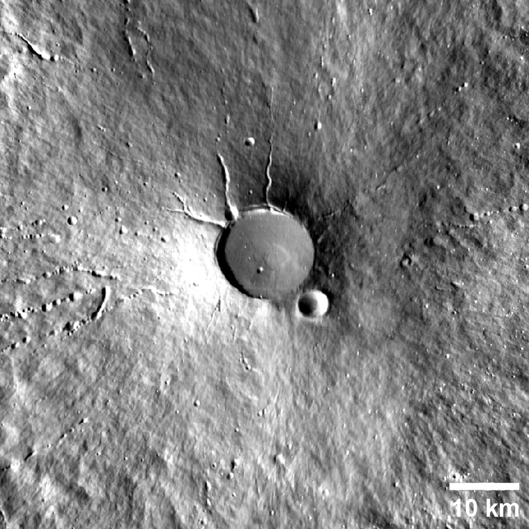 The shadows here reveal that this is actually a hill and not a crater. It is believed that this structure is a pingo. Pingos, which are are a perglacial feature, are raised mounds formed when underground water freezes to form ice, which expands and pushes up the overlying ground.