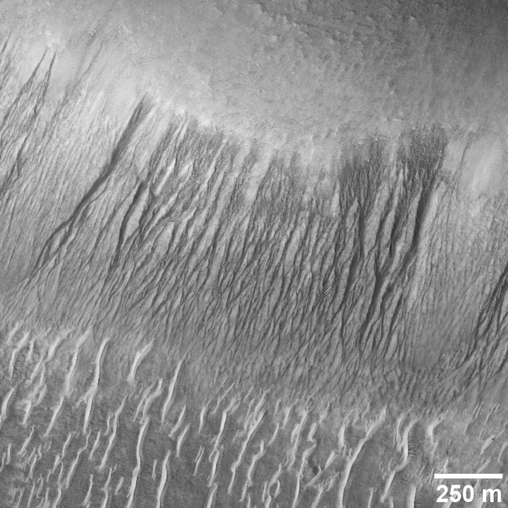 The dark lines here are on a flat plain rather than a slope. They mark the paths of dust devils swirling across the landscape, removing fine-grained dust from the surface to reveal the underlying darker rock.
