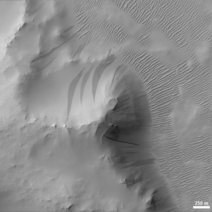 These dark slope streaks are located on the wall of a crater. Their shape is very similar to that of fine powdery snow avalanches on Earth, but on Mars these are avalanches of fine-grained dust.